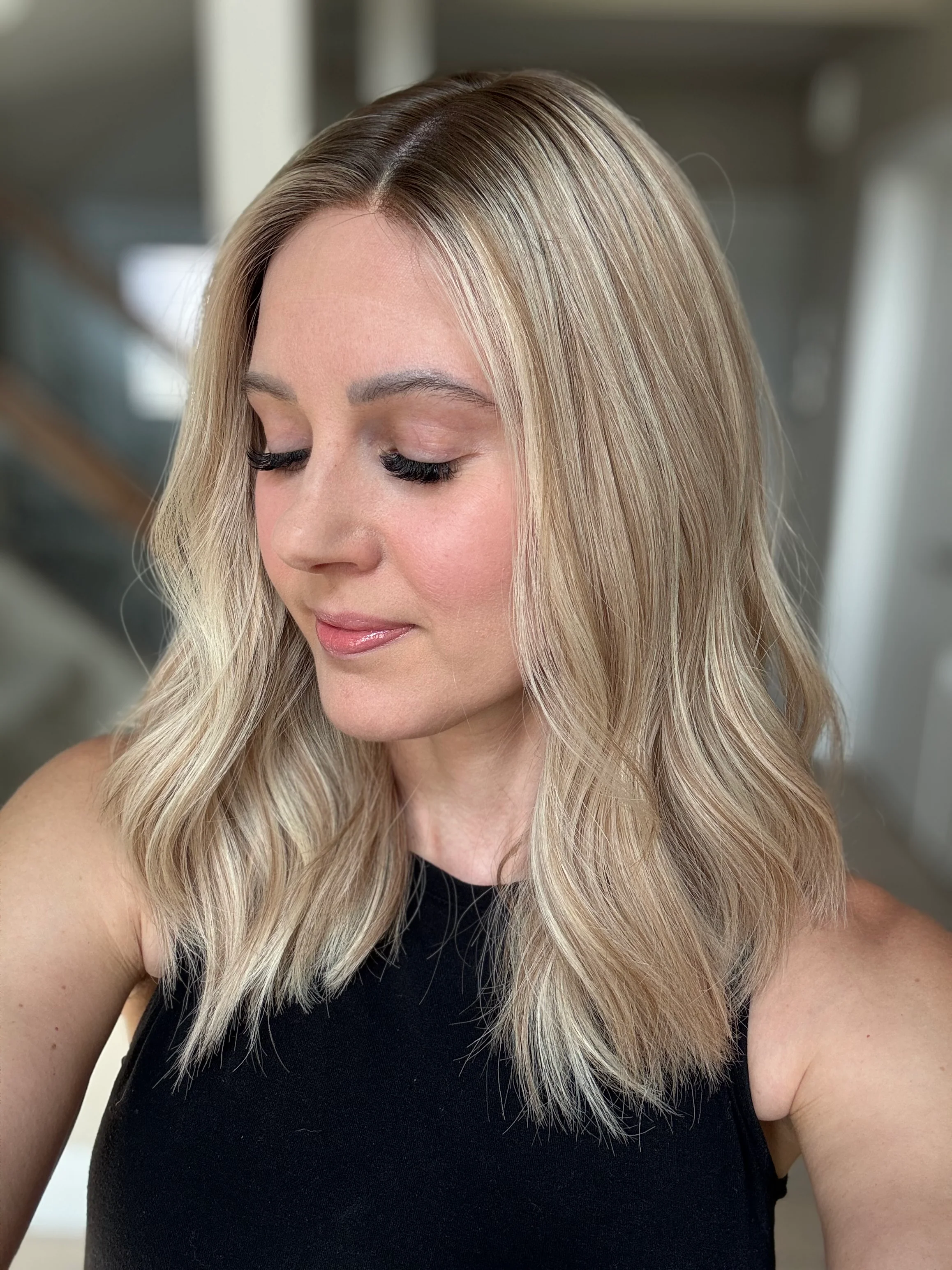 * Color: Neutral light blonde with subtle lowlights and a medium brown root.