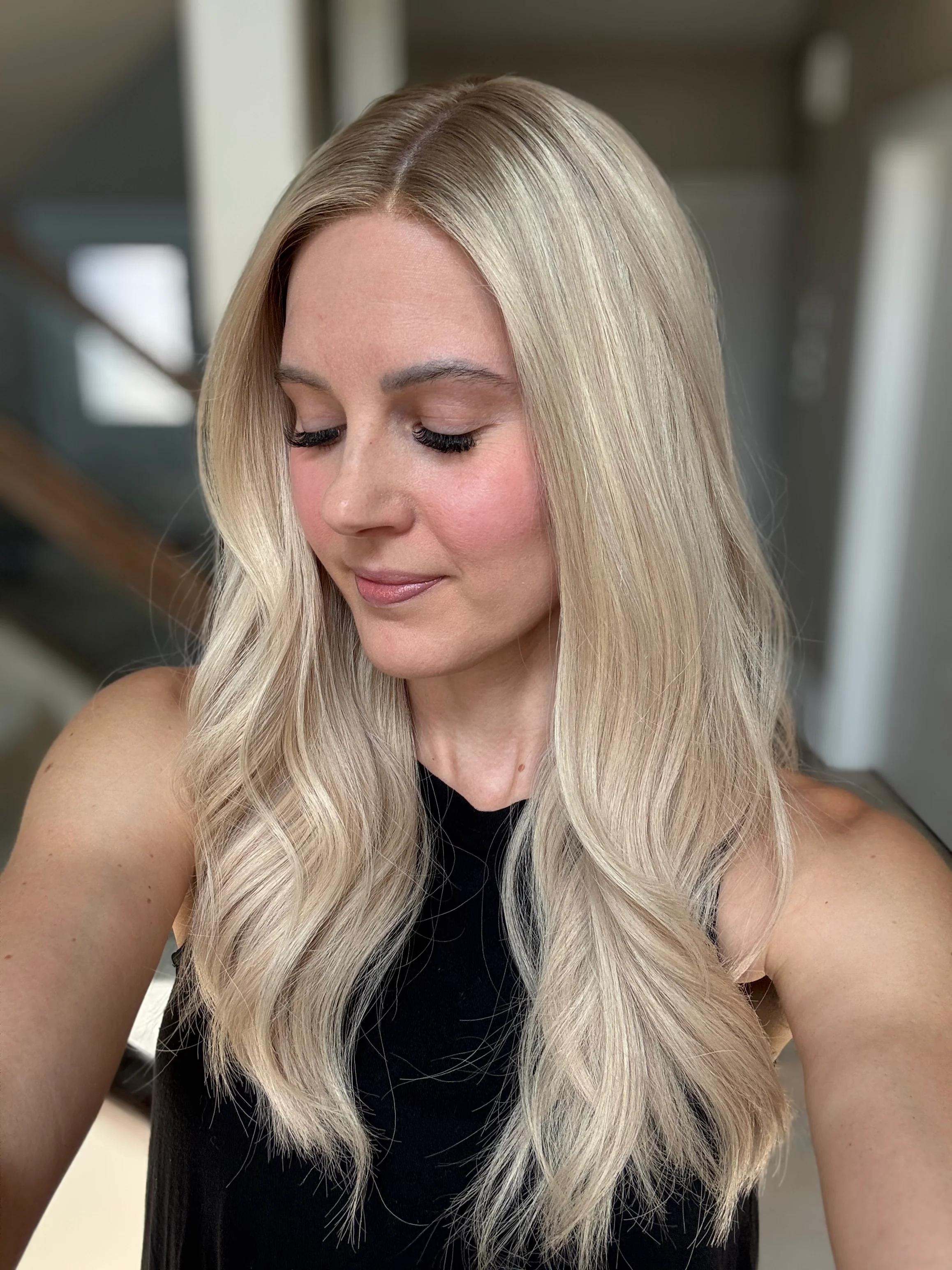 * Color: Neutral light blonde with a dark blonde cool root.