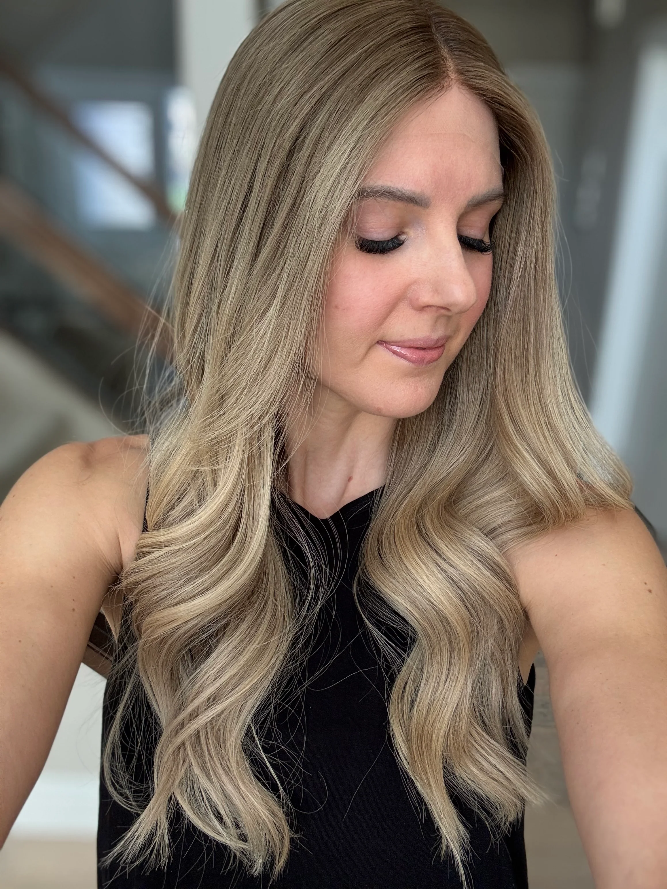 * Color: Sandy blonde with a neutral light brown root melt.